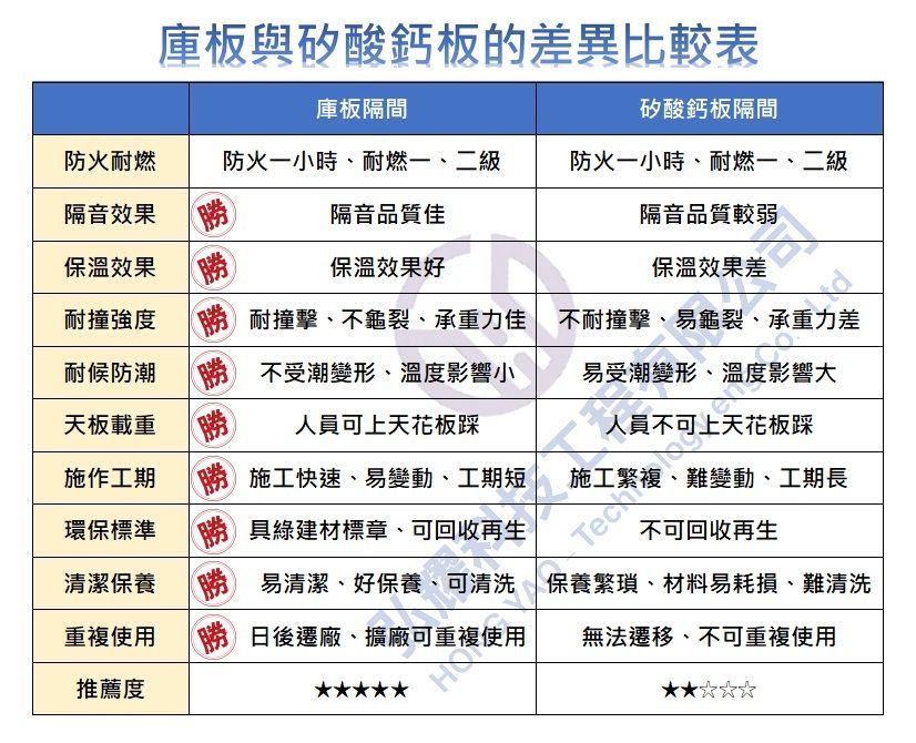 金屬庫板隔間具有「防、音、環保、防潮、好清潔、工期短、可重複使用」等特性